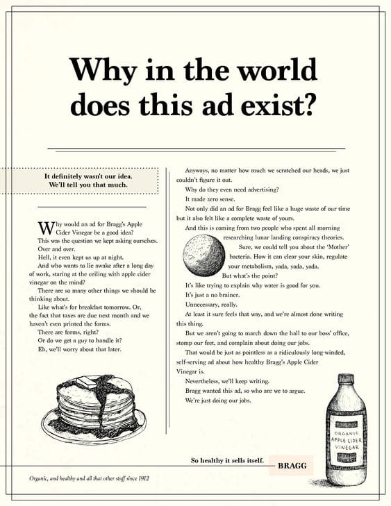 Excerpt from Bragg Apple Cider’s “Why in the world” Ad