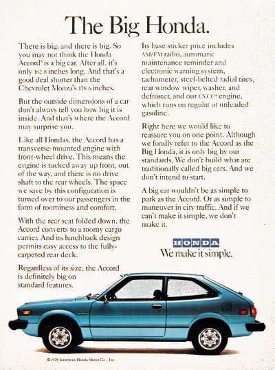 There is big, and there is big. So you may not think the Honda Accord is a big car. After all, it’s only 162.8 inches long. And that’s a good deal shorter than the Chevrolet Monza’s 178.6 inches.