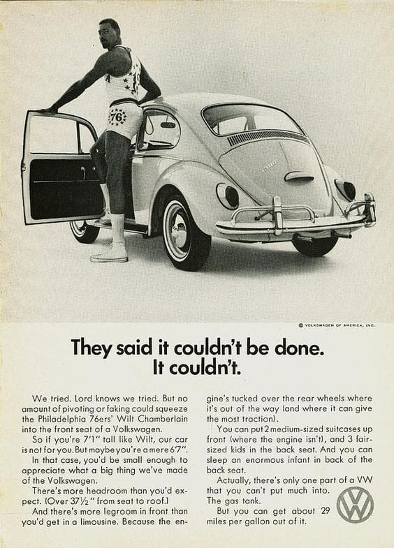 We tried. Lord knows we tried. But no amount of pivoting or faking could squeeze the Philadelphia 76ers’ Wilt Chamberlain into the front seat of a Volkswagen.
