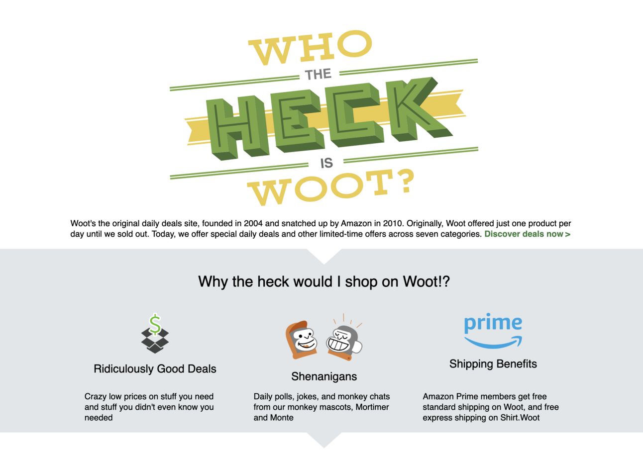 Woot’s the original daily deals site, founded in 2004 and snatched up by Amazon in 2010. Originally, Woot offered just one product per day until we sold out. Today we offer special daily deals and other limited-time offers across seven categories.