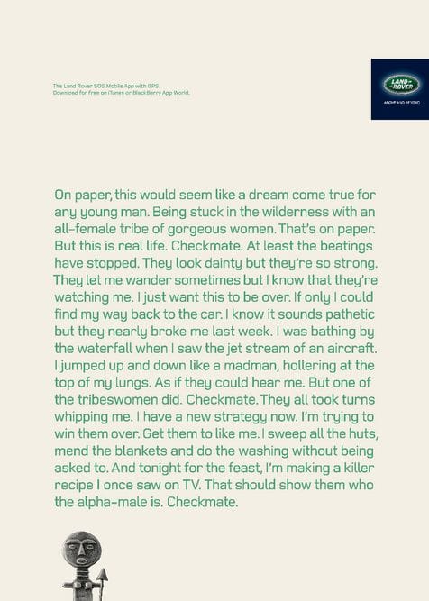 IOn paper, this would seem like a dream come true for any young man. Being stuck in the wilderness with an all-female tribe of gorgeous women. That’s on paper. But this is real life. Checkmate. At least the beatings have stopped. They look dainty but they’re so strong. They let me wander sometimes but I know they’re watching me. I just want this to be over. If only I could find my way back to the car. I know it sounds pathetic but they nearly broke me last week. I was bathing by the waterfall when I saw the jet stream of an aircraft. I jumped up and down like a madman, hollering at the top of my lungs. As if they could hear me. But one of the tribeswomen did. Checkmate. They all took turns whipping me. I have a new strategy now. I’m trying to win them over. Get them to like me. I sweep all the huts, mend the blankets and do the washing without being asked to. And tonight for the feast, I’m making a killer recipe I once saw on TV. That should show them who the alpha-male is. Checkmate. 🏁