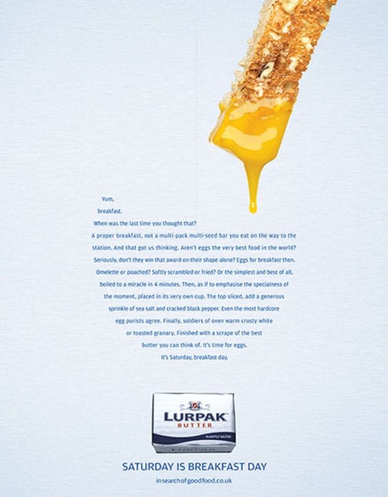 Implicit seed planted. “Finished with a scrape of the best butter you can think of.” → “Well actually, that butter you just imagined? Yeah Lurpak is that good, it’s the butter you should have thought of 😉”